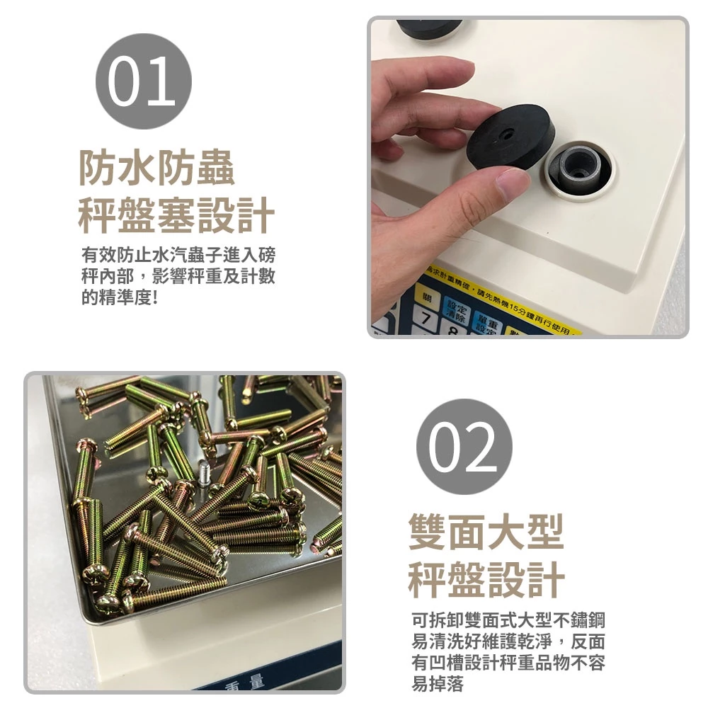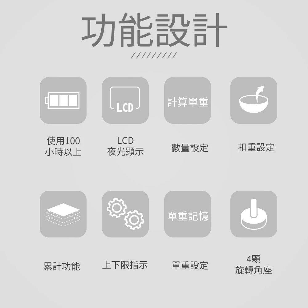 *具備自動校正、自動歸零、全段扣重、累加記憶、自動關機、重量/數量過載警示機能