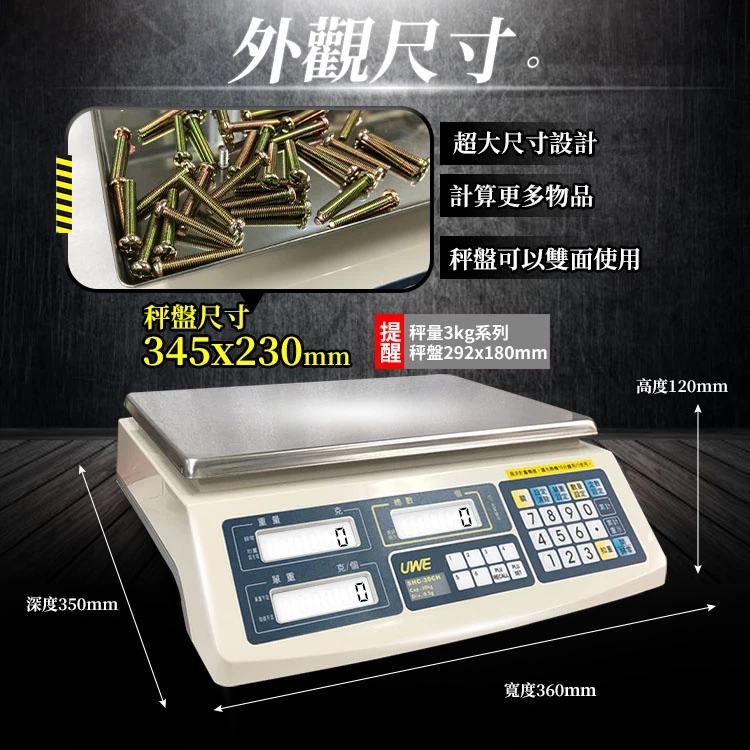 | SHC-30CH | 30kg | 0.5g | 345*230 (大秤盤) |